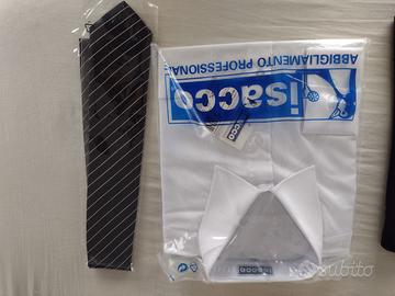 Vendo componenti abito da sala, scuola Stringher. Mai usati. Con etichetta. Pantaloni neri taglia 48 (19 euro), camicia bianca XL (16 euro), gilet nero taglia L (18 euro), cravatta (8 euro).
