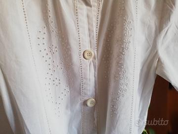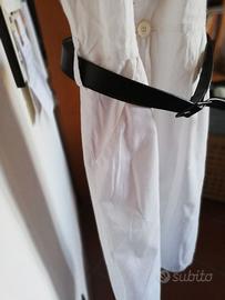 Abito in lino-cotone, taglia 44, bianco, abbottonatura totale sul davanti, sangallo sul petto, tasche laterali, cintura blu.