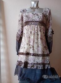 tg. 40. zip laterale. semitrasparente, con doppia fodera dalla vita in giu . in vita misura 36cm. maniche a sbuffo. scollo ampio.