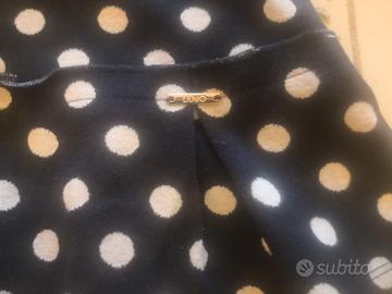 Abito Liu Jo blu a pois bianchi con balze e con spilla a forma di rosa per bambina, taglia 4 anni. Presenta una piccolissima macchia sul retro della manica sinistra.