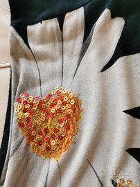 Colore nero, taglia M, scollo a V, decorazione classica di tale brand sul davanti. Una manica in tessuto operato e l'altra in tessuto liscio. Non ricordo la tipologia di tessuto perché in genere, dopo l'acquisto, elimino l'etichetta.
