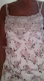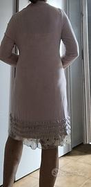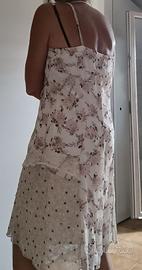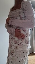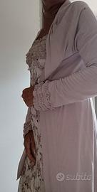 abito floreale con delle balze in pizzo laterali il copri spalle e il copri abito ha le maniche lunghe, il vestito ha le spalline