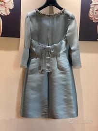 Spagnoli in misto seta, colore azzurro chiaro, scollo rotondo con applicazioni floreali, maniche 3/4 con doppio volant semitrasparenti, schiena