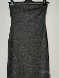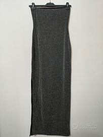 Abito lungo senza spalline luccicante. La parte superiore del vestito presenta una fascia in silicone antiscivolo che corre lungo tutto il bordo interno, garantendo una vestibilità sicura, e la parte inferiore presenta uno spacco sul lato sinistro. L'abito è foderato per assicurare comfort e una caduta impeccabile. Perfetto per serate speciali.
