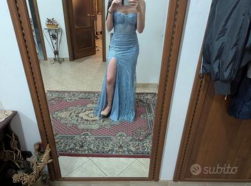 Articolo in ottime condizioni. È stato utilizzato solo una volta per un matrimonio e poi riposto nell'armadio. Indossa aderente e risalta le curve. È stata fatta una spaccatura sul lato destro (come visibile in foto) dalla sarta.