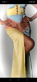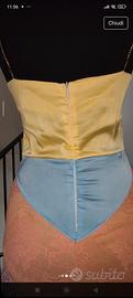abito lungo tipo sottoveste (slip dress)con scollo a corsetto e spalline sottili. L'abito presenta un design a blocchi di colore, principalmente giallo e azzurro pastello, con inserti in pizzo color pesca sul corpetto e sui fianchi che imitano la biancheria intima.