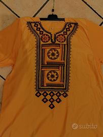 Elegante abito lungo arancione con dettagli ricamati sul collo e sul fondo.