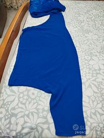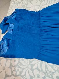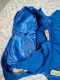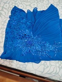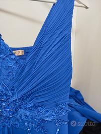Abito lungo blu royal taglia S/M. L'abito stile impero è molto elegante indossato, sul davanti ha un ricamo rifinito con strass, gonna in schiffon. Veste comodo sia una S che una M . Indossato solo nel camerino del negozio poi mai messo per cambio colore della cerimonia. In regalo il coprispalle abbinato, anche questo indossato solo nel camerino. Per altre informazioni e foto contattatemi.