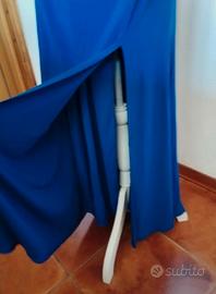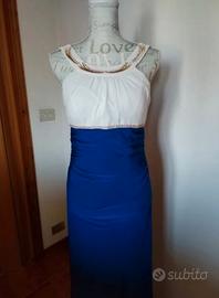 Abito da cerimonia lungo in stile impero, bicolore bianco e blu elettrico. Il tessuto è elasticizzato (veste S-XS) e il corpetto ha coppe preformate con decori oro e strass. Dettagli: Taglia: S (attillato) Lunghezza: fino ai piedi (ideale per altezza 1.65m circa) Extra: Includo stola abbinata e custodia protettiva. Condizioni: Il vestito è stato usato una volta ed è in buone condizioni. Segnalo per correttezza una piccola sfilacciatura sul bordo del sottogonna (non visibile dall'esterno) e un lievissimo segno sul tessuto altezza ginocchio (vedi ultime foto). Prezzo ribassato per questi piccoli dettagli. Perfetto per una serata speciale o un evento senza spendere una fortuna! LA VENDITA DEI MIEI ARTICOLI AVVIENE TRAMITE SPEDIZIONE INTEGRATA, NO INCONTRO DI PERSONA.