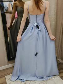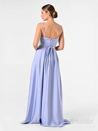 Realizzato in raso, presenta spalline sottili regolabili che possono essere nascoste per un effetto senza spalline, un delicato inserto in tulle sur-ton, una cintura removibile con passanti che esalta il punto vita e una gonna ampia con spacco che dona movimento e leggerezza alla silhouette.
