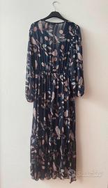 Abito lungo Conbipel in tessuto leggero e fluido, caratterizzato da un'elegante stampa con rami e uccellini nei toni rosa e pastello su fondo blu.