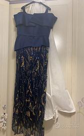 Abito lungo da cerimonia donna firmato Maestri Haute Couture, collezione primavera/estate 2024.Modello a sirena blu con paillette oro con scollo omerale e spalline sottili elegante in tessuto mikado blu raffinato e luminoso. Indossato solo 1 giorno per l’occasione di un matrimonio Taglia 48 Prezzo 350 euro