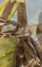 Abito da cerimonia lungo marca Nenette di tessuto leggero di colore giallo e corpetto in color bronzo con lustrini e spalline a tutta lunghezza dello stesso colore dell’abito. Indossato una sola volta e lavato in tintoria