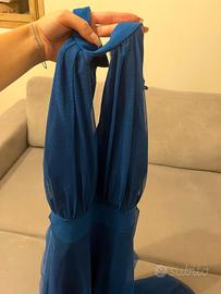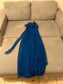 Abito lungo da cerimonia in un bellissimo colore blu intenso, modello con scollo all’americana e gonna fluida in tessuto leggero e morbido.