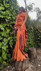 Vestito lungo da cerimonia. Bohemian Vì Collection.Bellissimo vestito con dettagli particolari, cat out sulla vita,ma discreto, scollatura asimmetrica, balza doppia rouche con spacco. Chiusura con zip, foderato Indossato due volte. Impercettibili sfilature da braccialetto