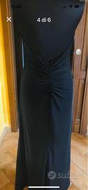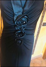 splendido abito boutique, adatto a serata di gala e per cerimonia, con scollo all'americana e bellissima scollatura con rifiniture smoking e splendide roselline raso con brillantini, spacco sul davanti,