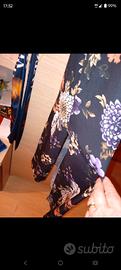 abito nero con fantasia floreale con due spacchi davanti e incrocio a V elastico in vita e nei polsi qualche imperfezione leggera una volta indossato non si nota