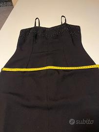 Abito lungo nero con ricami sul corpetto, spalline sottili, chiusura posteriore con zip, spacco posteriore, foderato