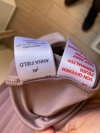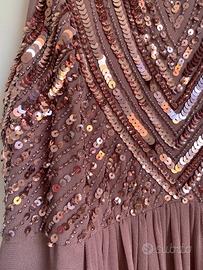 Splendido abito lungo color rosa cipria/malva, ideale per matrimoni, cerimonie ed eventi eleganti. Il corpetto è impreziosito da ricami geometrici con paillettes luminose che valorizzano il décolleté, mentre la gonna lunga e fluida cade morbida creando un effetto molto elegante e raffinato. Taglia 34 (XS / 38 IT), direi che veste anche una 40. Indossato una sola volta come damigella, conservato con cura, necessita solo di un rinfresco/lavaggio perché inutilizzato da tempo. Chiusura sul retro. Vestibilità molto comoda e femminile. Perfetto per chi cerca un abito elegante e d’effetto senza spendere troppo ✨