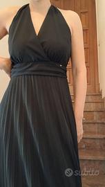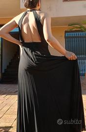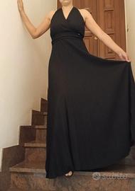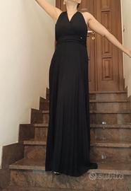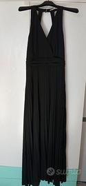 Vestito maxi nero con corpetto a portafoglio e gonna plissettata.Stretto in vita e chiusura zip.Gonna foderata no trasparente.Dettaglio sul collo due bottoni.Schiena scoperta . Sensuale, Intrigante. Vestibilità 44 Ascelle. 98,Vita 78, Gonna 114, Corpetto 38 Totale lunghezza 152 Brand Gaudi Nuovo.