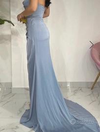 Elegante abito lungo color lilla con spacco alto sulla gamba e scollo a cuore drappeggiato. Vestibilità aderente che valorizza la figura e tessuto fluido molto elegante