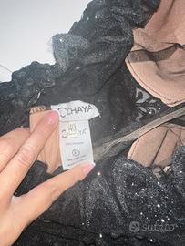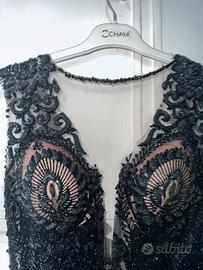 Bellissimo abito lungo nero con base color nude e ricami in pizzo nero impreziositi da perline e dettagli luminosi.