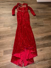 Vendo abito lungo rosso con paillettes, super luminoso e d’effetto. Modello elegante e sensuale con scollo profondo, ideale per feste e serate importanti. Usato pochissimo, condizioni ottime. Possibilità di spedizione o ritiro a mano.
