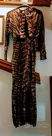 Abito vintage di alta sartoria, paillettes su seta, foderato, taglia 42/44. Lunghezza dalla spalla cm 145 Lunghezza manica cm 65 Circonferenza giro vita cm 64 Profondo scollo sulla schiena, maniche a pipistrello, leggermente rimborsato in vita. Perfetto e rifinito nei particolari.