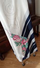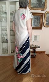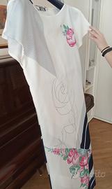 Fondo bianco decorato con motivi geometrici e floreali,linea dritta con spacchi laterali e sulle spalle, misure: spalle cm.40 ,vita cm.100 ,fianchi cm.110, lunghezza cm.140. Ottima vestibilità.