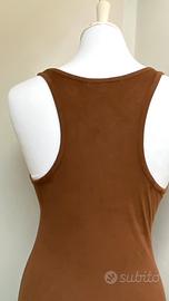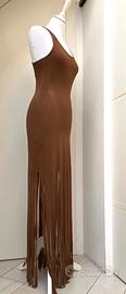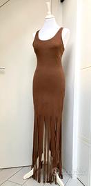Abito lungo morbidissimo, con frange , sembra alcantara ma non ha più il cartellino . vestibilita’ ottima Indossato 1 volta , come nuovo. Taglia S