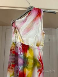 Elegante abito lungo con una stampa floreale vibrante e colorata. - Design monospalla. - Vita elasticizzata. - Tessuto leggero e fluido.