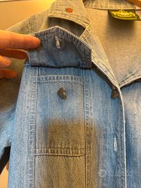 Abito lungo in tessuto Jeans Hammerschmid, aperto totalmente davanti, con bottoni in metallo a forma di cuore con motivo di stella alpina. Due tasche davanti sul petto chiuse da bottone, una tasca con ricamo di fiore con coccinella, più colletto con coccinella rossa sempre ricamata. Punto vita svasato cm 41, ascella cm 47, spalle cm , lunghezza totale cm 130.