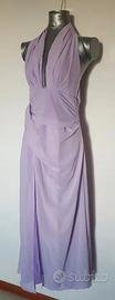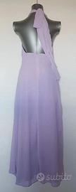 Raffinato abito lungo color lilla con allacciatura al collo e profondo spacco laterale, perfetto per cerimonie, eventi e occasioni speciali.
