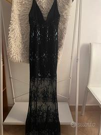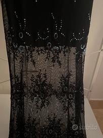 Abito lungo di pizzo con inserti di disegni ricamati su pizzo con paillette