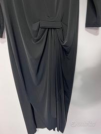 L'abito presenta un design fluido e drappeggiato, che conferisce un aspetto elegante e sofisticato.
