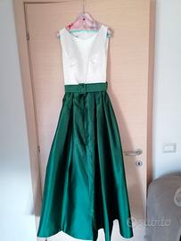 Abito intero in tessuto satin, corpetto color bianco avorio, cinta in tessuto, parte sottostante color verde bosco con spacco frontale tra le pieghe del tessuto ampio. Zip posteriore. Taglio sartoriale, NUOVO, MAI INDOSSATO. Taglia 40/42.