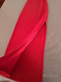 Splendido abito lungo con spacco in colorazione rosso acceso, ideale per serate speciali, cerimonie, eventi estivi o una serata fuori. Il design senza spalline (strapless) esalta la figura con un bustino elegantemente arricciato che valorizza il décolleté. Il tessuto, con una texture leggermente a rilievo, dona un tocco originale e lo rende comodo da indossare. La silhouette è slanciata e chic. Veste perfettamente e si adatta a diverse occasioni.