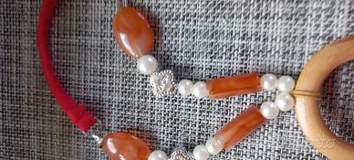 Allacciatura al collo, perline e anello in legno sul décolleté.