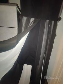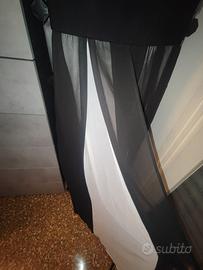 Il vestito è un tubino nero elasticizzato al ginocchio con scollo rotondo con velo nero e bianco cucito all' altezza della vita con apertura al centro. Cerniera posizionata lungo la schiena e piccolo oblò con bottoncino dietro al collo. All'acquisto avevo fatto accorciare il velo dalla sarta e tolto il cartellino ma in realtà non l'ho mai indossato. Si preferisce consegna a mano a Genova ma disponibile alla spedizione. Prezzo trattabile.