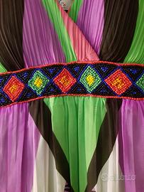Abito lungo stile impero a bretelline, molto scollato con coppe preformate . Sul dietro ha cuciture elasticizzate per una vestibilità migliore . fantasia molto estiva per un abbigliamento sbarazzino e giovanile . taglia unica. foderata, indossato pochissime volte ottime condizioni come nuovo. 100% poliestere