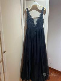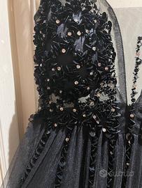 Abito lungo in tulle nero e applicazioni fiori in 3d. Usato solo una volta. Veste da una XS ad una M. Io sono alta 1.65 e porto tra una XS ed una S.