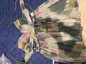 Vendo bellissimo abito lungo da donna, elegante e raffinato, ideale per cerimonie, matrimoni, feste o serate di gala. Colore verde, stampa floreare, taglia M, 65%cotone 35 %poliestere. Mai indossato per errore di misura.