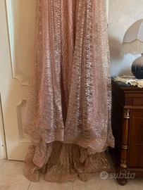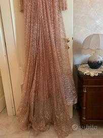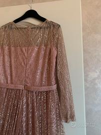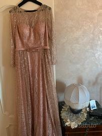 Elegante vestito lungo da sera o da cerimonia in colore rosa cipria o oro rosa, caratterizzato da un corpetto strutturato con scollo a cuore e maniche lunghe in tulle trasparente. L'intero capo è finemente decorato con paillettes e ricami scintillanti che creano motivi geometrici e lineari lungo tutta la figura.