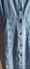Abito lungo in cotone viola, abbottonato sul davanti con eleganti bottoni in legno. Ricami in rilievo tono su tono sul corpetto e lungo la parte frontale. Maniche corte con dettagli ricamati.