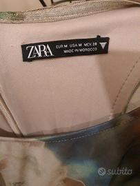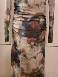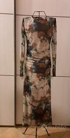 Bellissimo abito lungo Zara, in mesh, fantasia camouflage sfondo beige con toni marrone e verde. Drappeggio su ventre e fianchi, e zip sulla schiena.