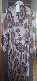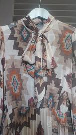Bellissimo abito estivo a fantasia con gonna plissettata. - Perfetto per occasioni speciali o per un look casual chic. - Vestibilità comoda e morbida. - Lunghezza midi. - gonna foderata. - Maniche lunghe. Collo coreana con fiocco. Elastico in vita ed ai polsi. No stiro. Lunghezza totale abito cm 110. Circonferenza seno cm 100. Circonferenza vita da cm 66 fino a cm 100. Spalle cm 38. Viscosa.