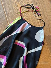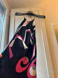 Abito lungo in raso di seta, originale Emilio Pucci, stampa vari colori (come da foto) , scollatura americana davanti con laccio di chiusura al collo, spalle nude e schiena nuda, con scollatura arrotondata, indossato 2 volte, perfetto stato, prezzo450euro.