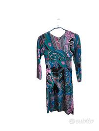 Abito Marella a fantasia nero/ottanio/blu/magenta/malva/grigio/beige. Scollo a V, taglio in vita, cinturina con fibbia metallica con pietre di color grigio scuro ( 2 pietre mancanti, visibili in foto, ma posizionando in maniera opportuna la cintura il difetto non è visibile).