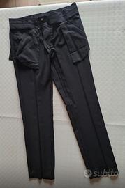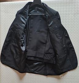 Abito Massimo Rebecchi due bottoni nero. Pantalone: lunghezza 102 cm con 5 cm di risvolto interno; larghezza gamba 19 cm; vita 42 cm. Giacca: larghezza spalla 45 cm; lunghezza manica dalla spalla 65 cm; lunghezza manica da ascella 44 cm; lunghezza totale giacca 77 cm.