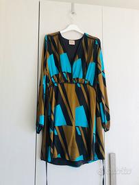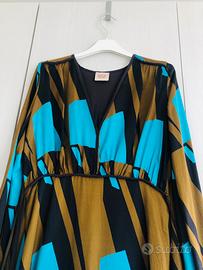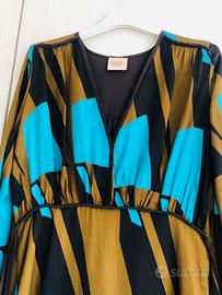 Bellissimo vestito marca originale MEME ROAD dai colori accesi del marrone e del turchese. Scollo a V, cinturino da allacciare dietro. Usato una volta. Perfetto. Taglia S